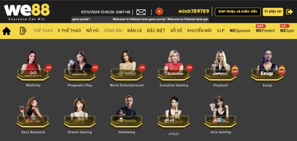Hệ thống chơi live casino tại website WE88 được phát triển mạnh mẽ với kho game đa dạng. Mỗi trò chơi tại từng sảnh đều được cung cấp từ những nhà chuyên phát hành game top đầu thị trường như: